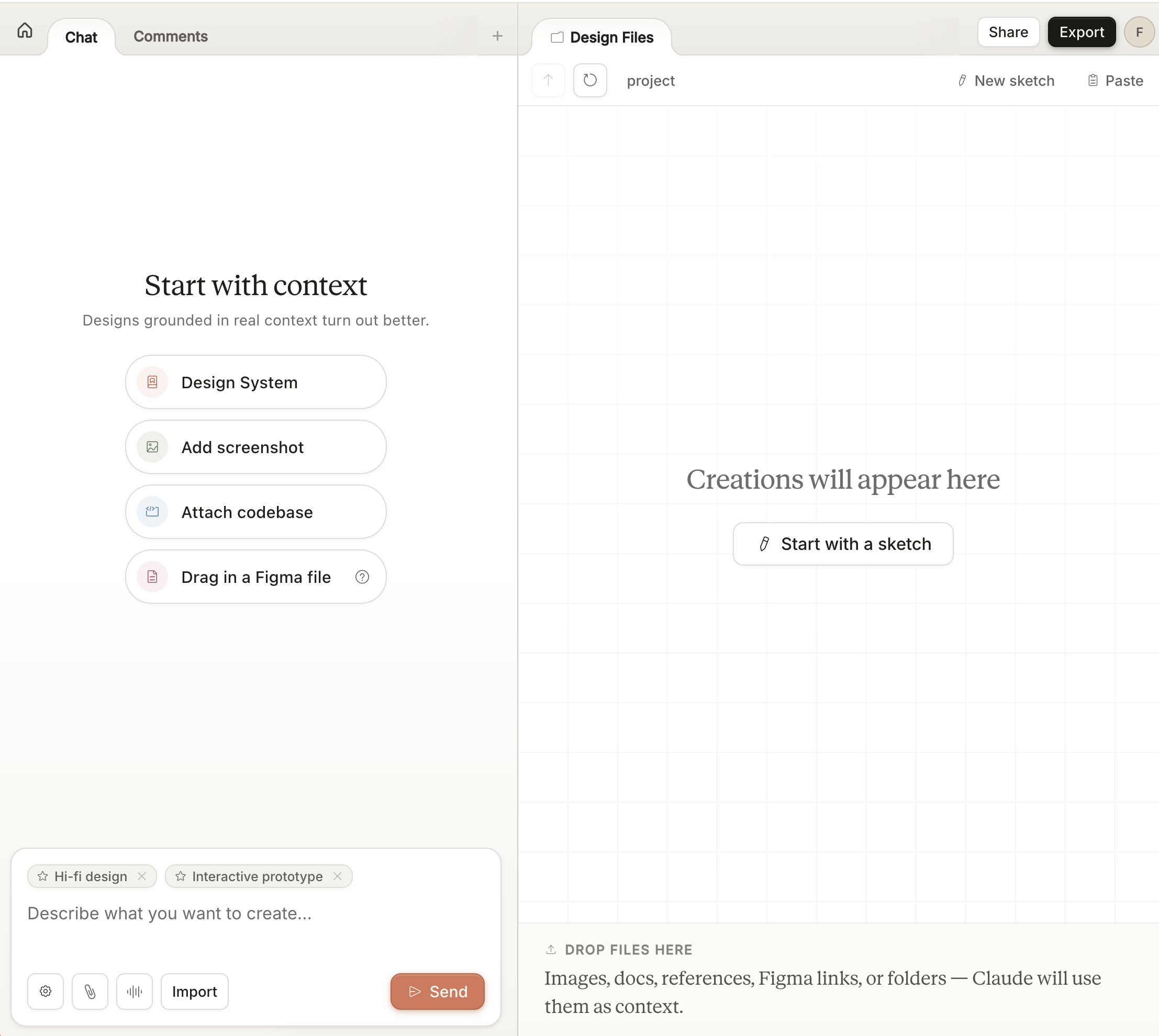 Il pezzo di comunicato che merita una lettura attenta riguarda proprio il design system. Claude lo costruisce durante l’onboarding leggendo codebase e file di design. Ogni progetto successivo riusa automaticamente colori, tipografia e componenti. Il sistema è raffinabile nel tempo, e i team possono mantenerne più di uno in parallelo (utile per aziende multi-brand, o per distinguere il design system del prodotto da quello del marketing, o quello interno da quello rivolto ai clienti).